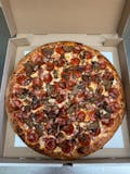 This pizza is topped with savory pepperoni, hearty sausage, crispy bacon, flavorful Italian sausage, and tender ham, all smothered in melted mozzarella cheese.